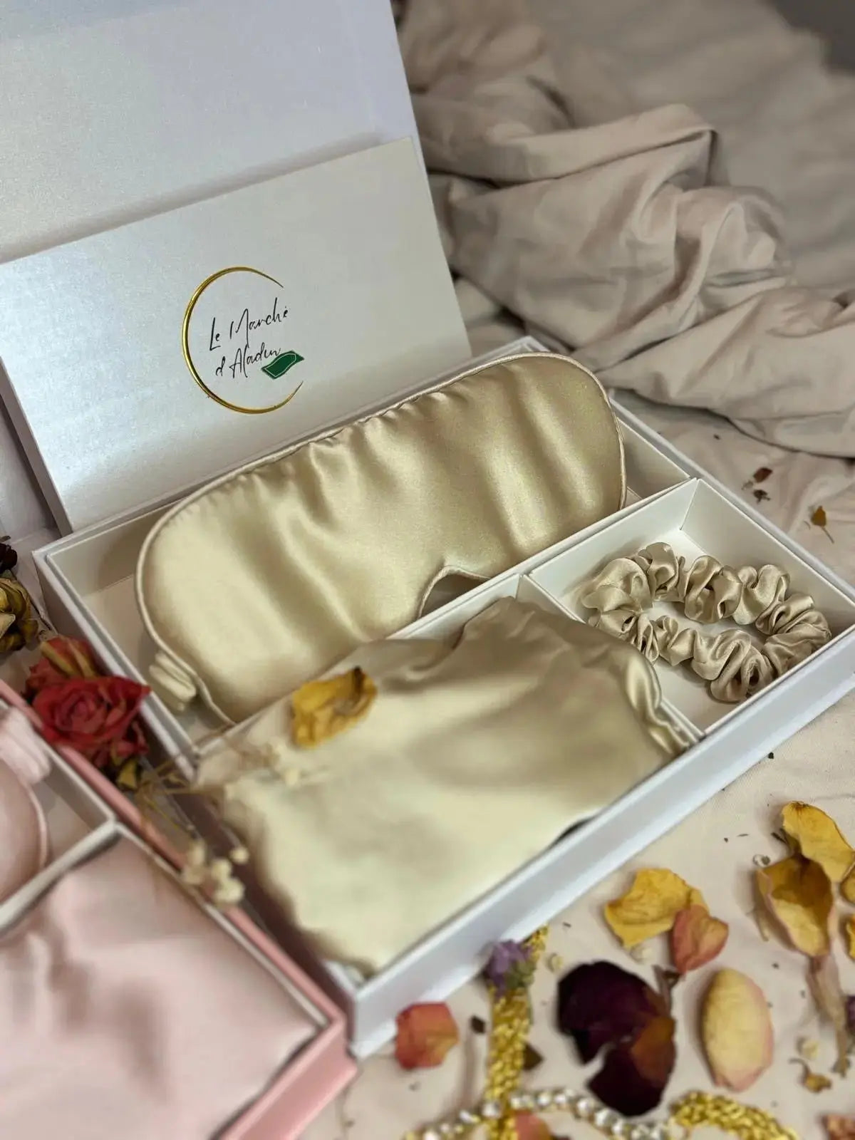 Chez Le Marché d’Aladin, nous sublimons la soie de mûrier, matière noble et précieuse, pour offrir des créations bien-être et beauté.